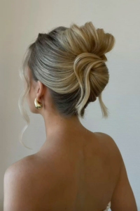 Textured updos pair especially well with balayage, dimensional blonding, and gloss services because subtle highlights create depth and definition within the style.