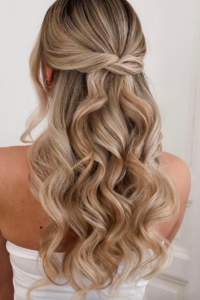 Half-up hairstyles continue to be a favorite for prom and bridal parties because they offer the perfect balance between structure and movement.